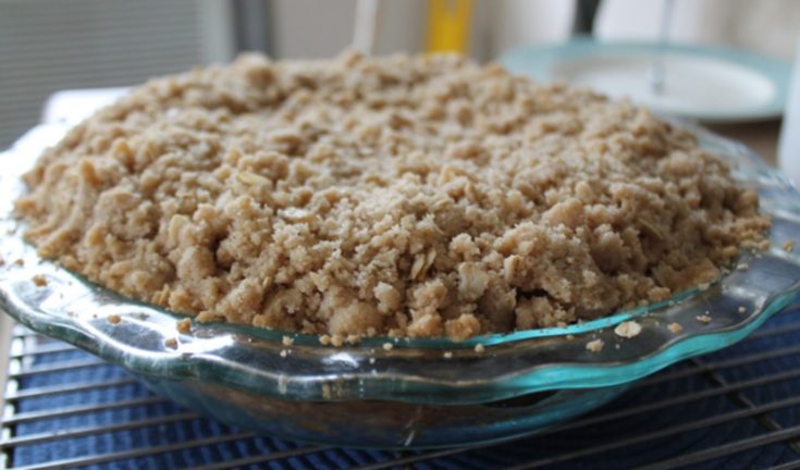 - While the pie is doing this initial bake, prepare the crumble by mixing all of the dry ingredients together in a small bowl. Add the butter and crumble together until it resembles a pea-sized coarse meal.